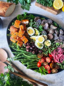 Once the potatoes are roasted, the eggs are soft boiled, the salmon is cooked and the green beans are blanched, we are ready to assemble this gorgeous salad.