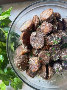 Once the baby potatoes are tender, I like to transfer them into a mixing bowl and sprinkle some grated parmesan, garlic salt and finely chopped parsley over them while they are still hot. This is optional, but delicious.