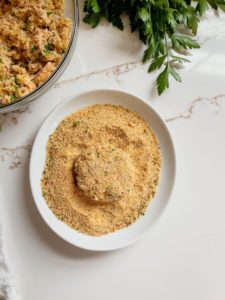 Add the remaining 1/2 cup of breadcrumbs onto a plate and press both sides of the patties into the breadcrumbs. This step is crucial as it creates a crust on the patties that not only tastes delicious, but helps to keep them together during the cooking process.