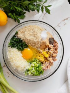 - Add 2 large whisked eggs (or 1 egg and the liquid from the salmon can), 1 cup of panko breadcrumbs, 1/4 cup of grated parmesan, 1 teaspoon of lemon zest, 1/2 teaspoon of garlic powder, 1/2 teaspoon of onion powder, 1/4 teaspoon of salt, 1/8 teaspoon of black pepper, 1 tablespoon of freshly squeezed lemon juice, 2 thinly sliced spring onions and 1/4 cup of finely chopped fresh parsley