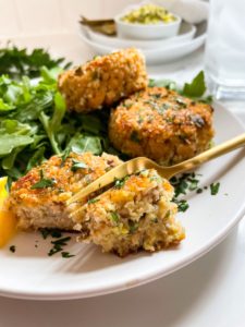 If you need to cook your salmon patties in batches, I suggest whipping the skillet with a paper towel and adding fresh butter and olive oil before adding the next batch.