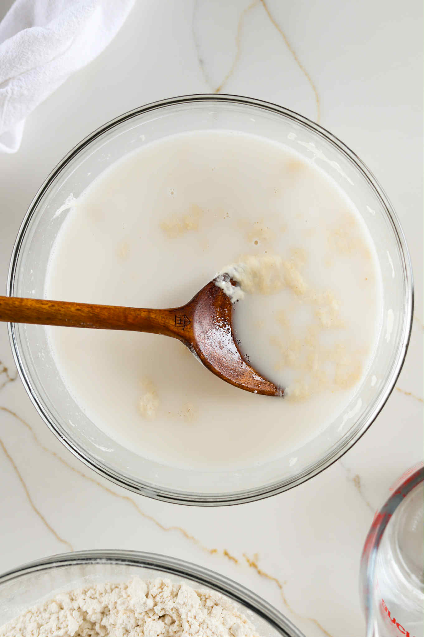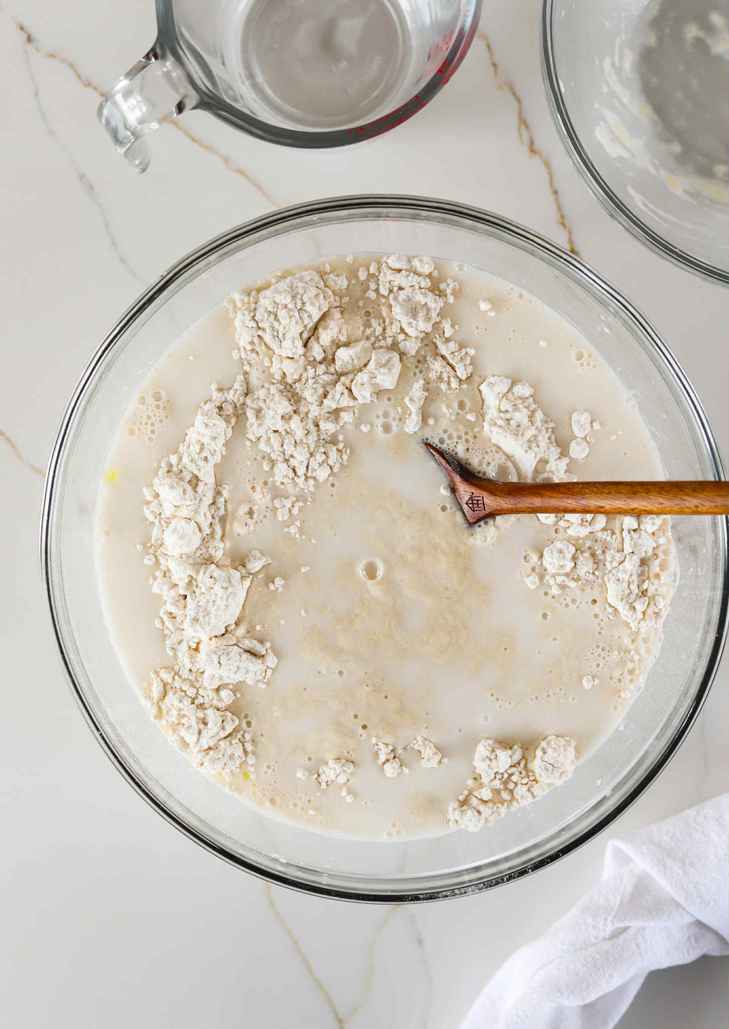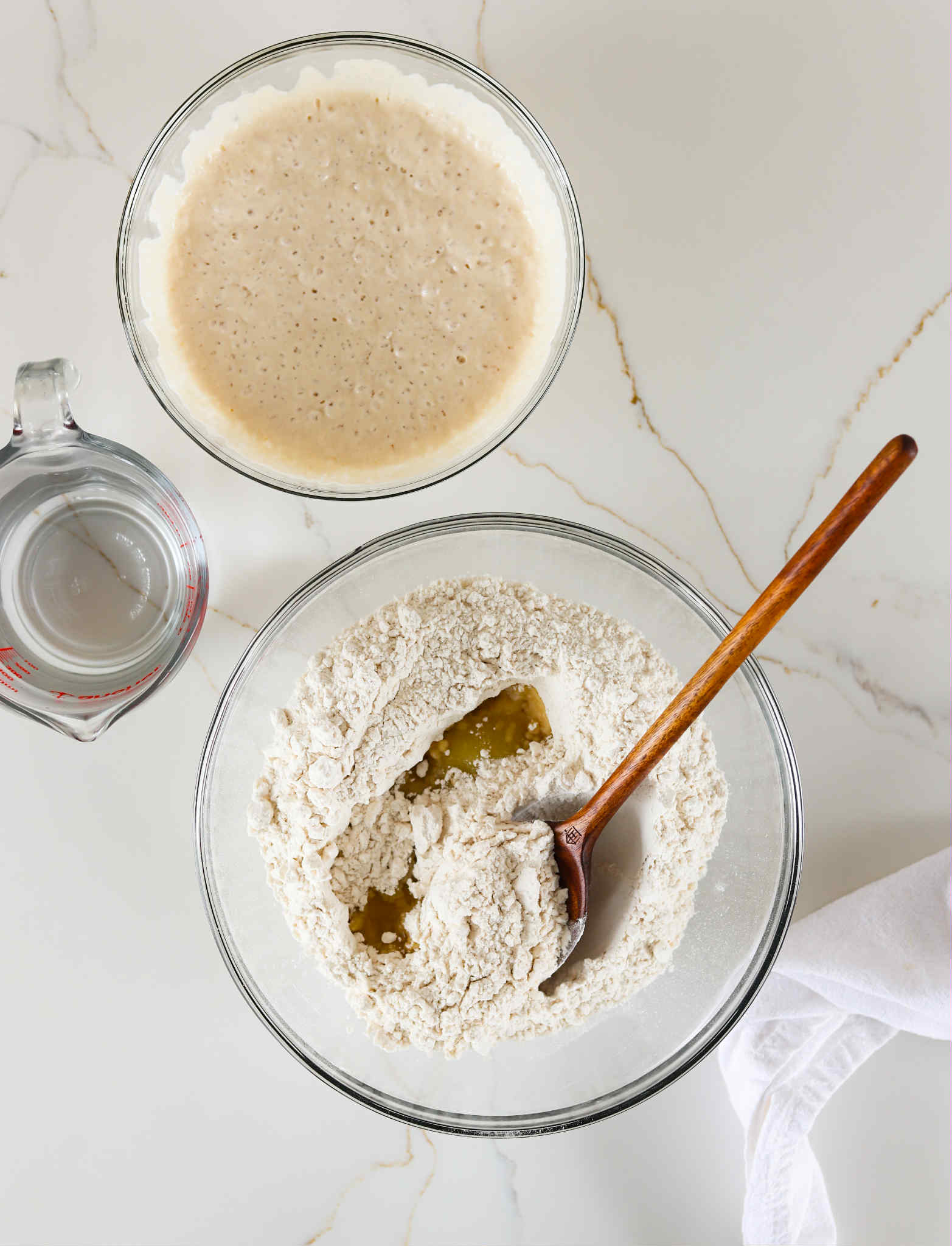 Add 340 grams (1 1/2 cups) of warm water in with the poolish and mix it around to break it up. We aren’t looking for it to become smooth or anything, we just want the poolish loosened a bit, so it incorporates into the flour easily.