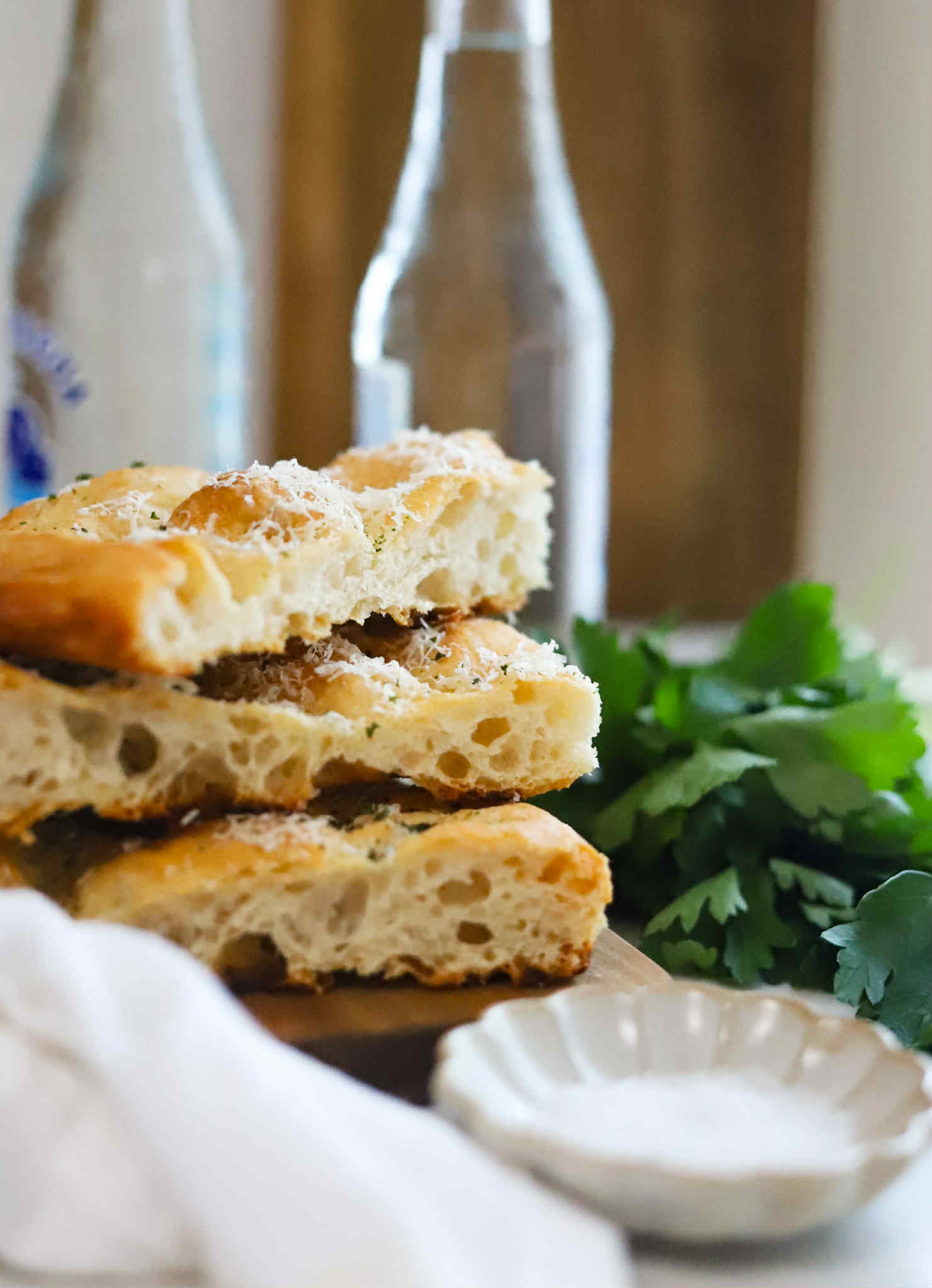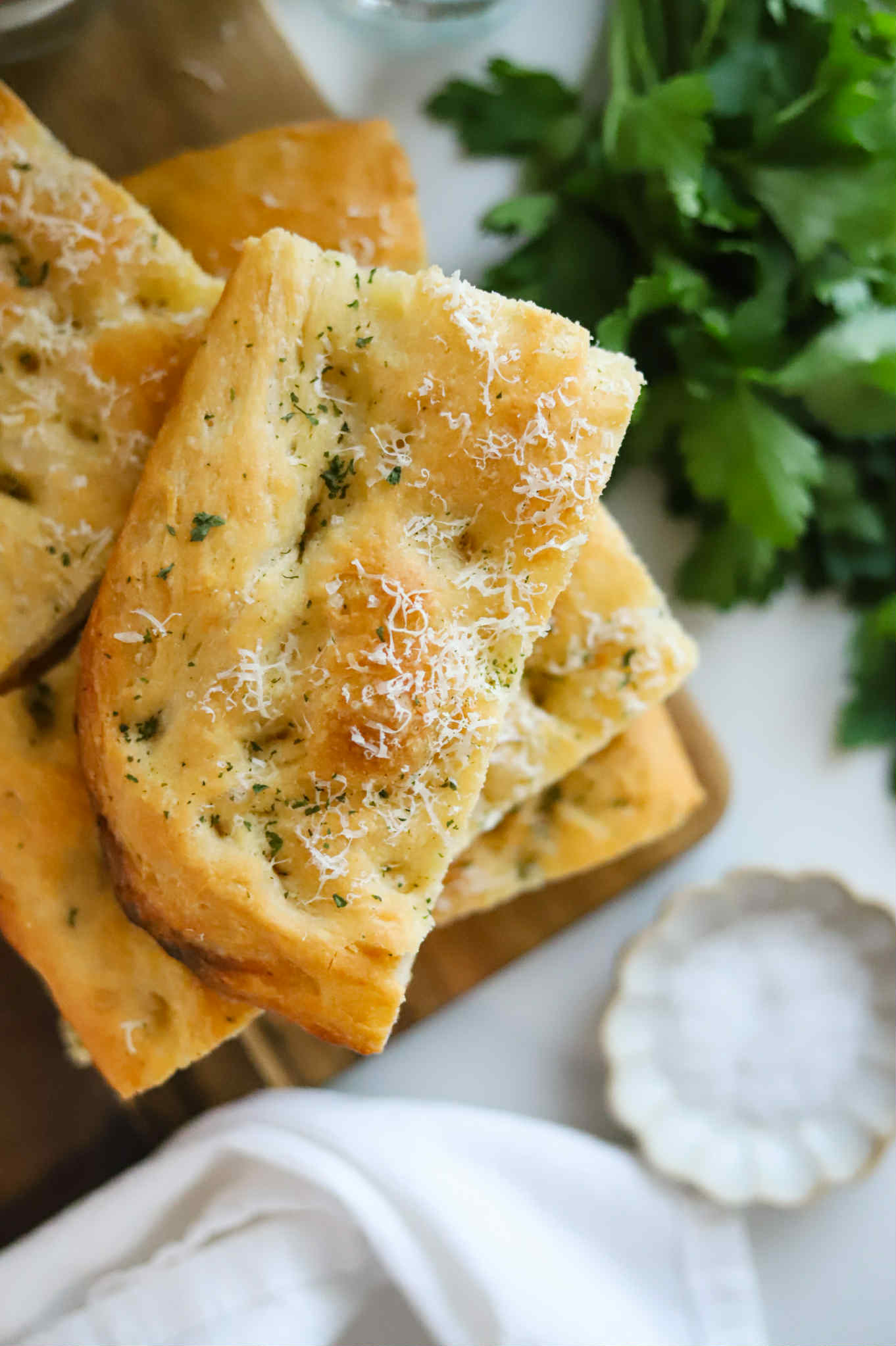 This bread is so fantastic. Buttery, crisp, chewy and incredible delicious. It is great as is, so this makes a great bread to serve with dinner. No butter or dip necessary.