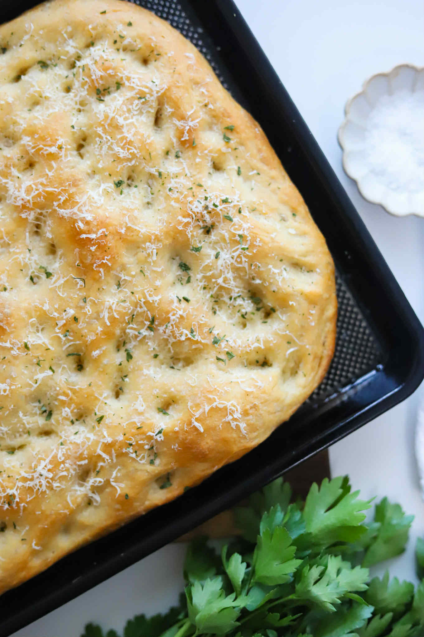 To bake all of your dough on the same baking sheet, you will need a 12″x17″ baking sheet, but I usually divide the dough between 2 or 3 smaller baking sheets. I love making paninis with this bread, so I often divide the dough between 3 smaller baking sheets. You really can’t go wrong here. If the baking sheet is a little “small” for this recipe, your dough will just be a little thicker and if you end up dividing it between 3 baking sheets and it ends up spreading a little thin, you’ll just have thinner, more crisp schiacciata. Both are fantastic.