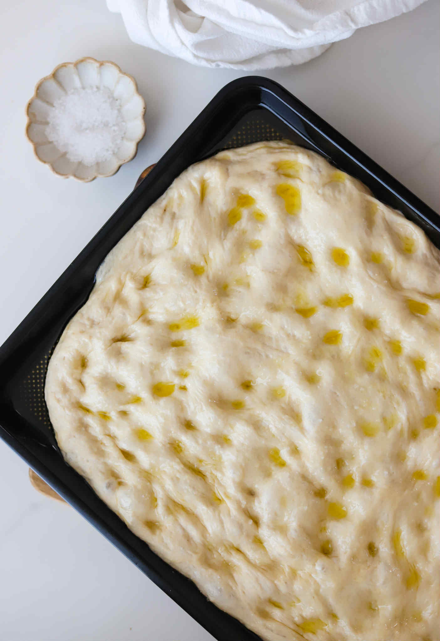 After the final stretch and fold, transfer the dough onto large rimmed baking sheet that has been generously coated in olive oil.