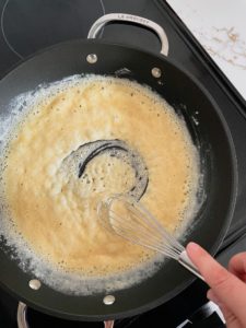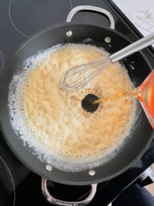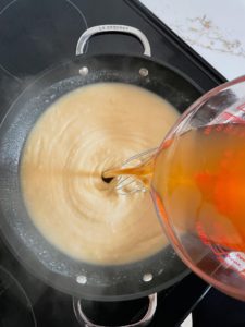 Sprinkle a half cup of all purpose flour over the melted butter and begin whisking to incorporate the flour into the butter. Continue whisking the flour and butter paste or “roux” as it cooks.