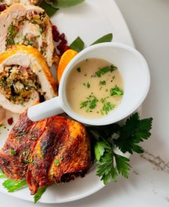 Gravy is often made with the drippings of a roast turkey, chicken or beef, but sometimes you need a gravy and don’t have any drippings to work with. This simple pan gravy is for these very occasions. It can be made with chicken, turkey, beef or vegetable stock and can be flavored with bouillon cubes and fresh or dried herbs.