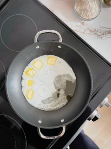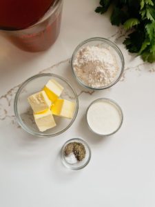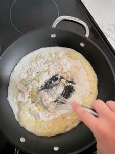 - As soon as the butter has melted, whisk in 1/2 cup of all purpose flour and cook for about a minute while whisking