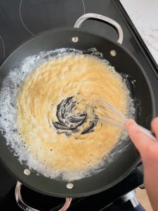 After about a minute of whisking the flour and butter over medium heat, it should be lightly golden and have a nutty aroma. Keep whisking to prevent the mixture from burning.