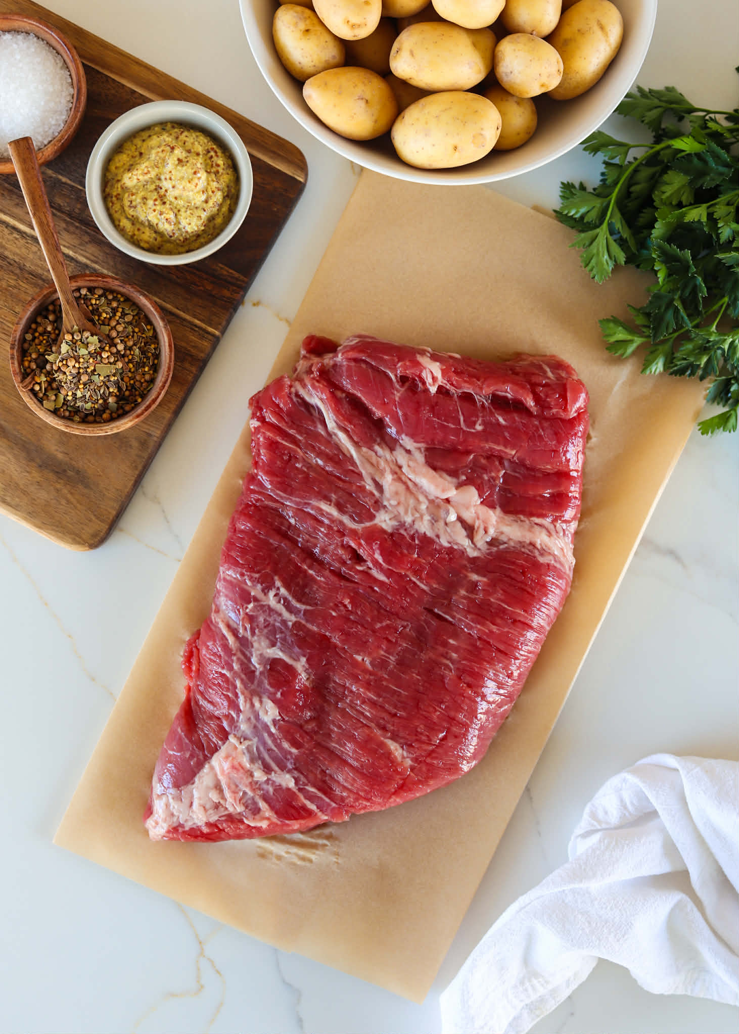 If you are making this corned beef around St Patricks Day, then it should be very easy to find flat cuts of beef brisket and corned beef seasoning packets. If you are making your corned beef in the “off” season, pick out a nice flat cut of brisket and grab some pickling spices from the spice aisle.