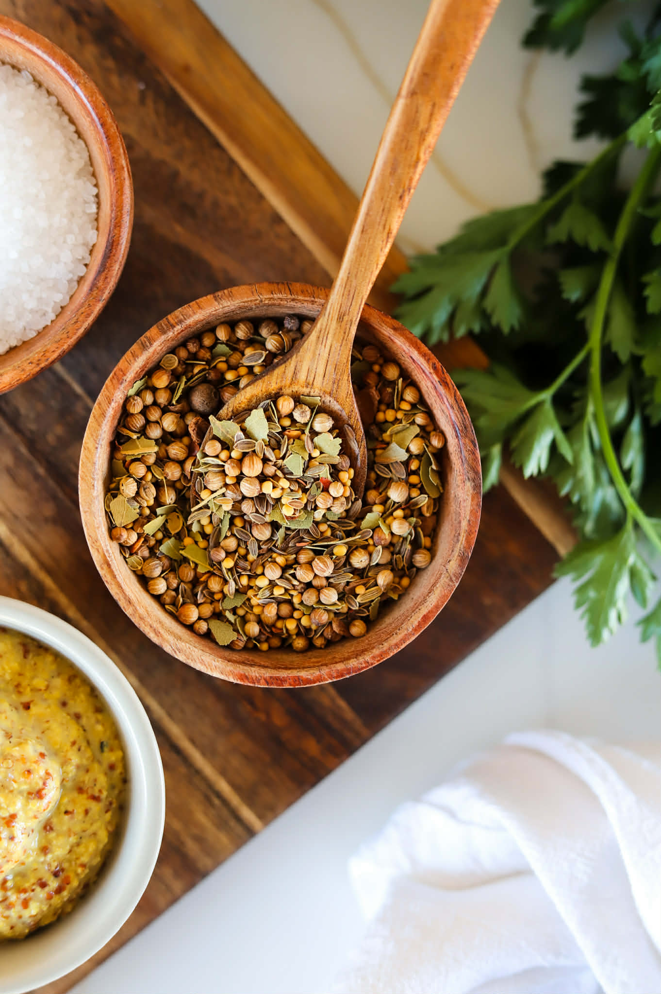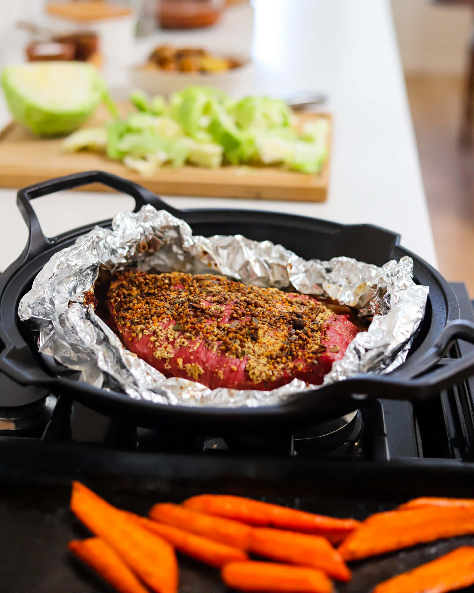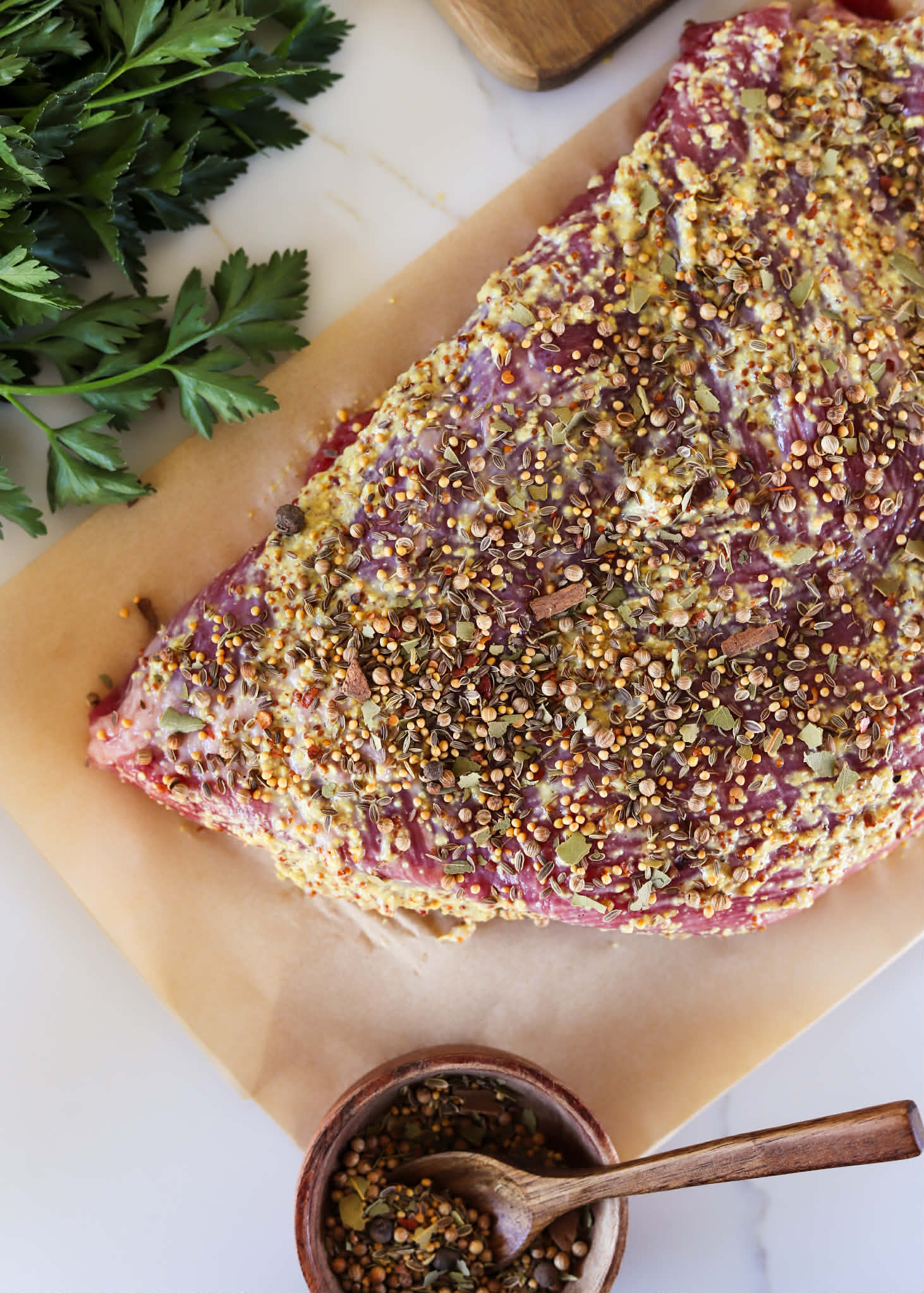 The seasoning blend is not “spicy”, but it packs a great punch of savory flavors. If you are concerned about the size of the seeds in the spice blend, they will remain on top of the corned beef during baking and although their flavors will make their way into the brisket, the spices will stay on top. They can easily be brushed off after the roasting process, if you prefer, but I highly recommend using them. They are a huge part of achieving the classic corned beef flavor.