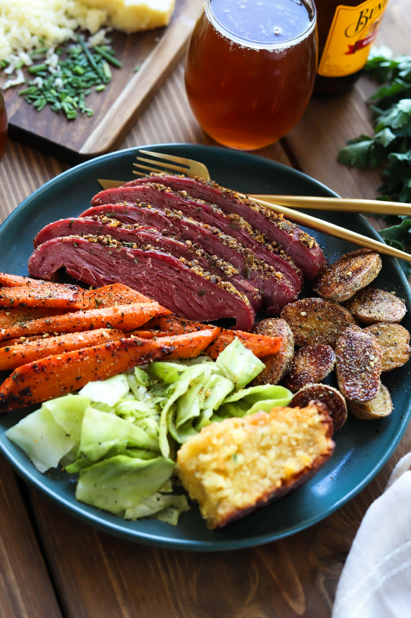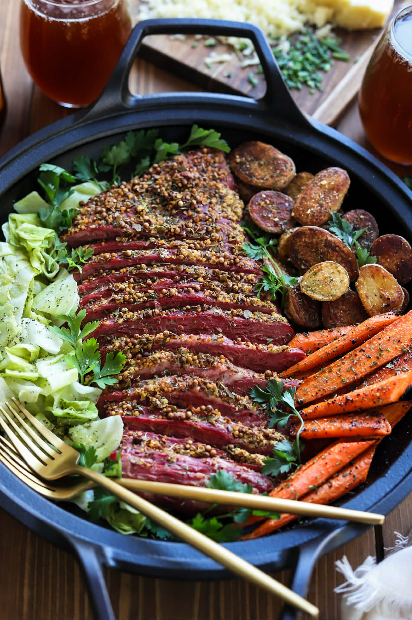 This corned beef is absolutely amazing. So beautifully tender and juicy. It literally falls apart with a fork, so if you want pretty slices, be sure to let it rest and use a very sharp knife…