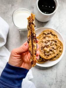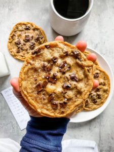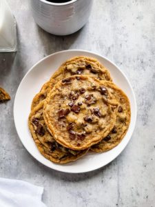 These cookies need to cool a bit before you pick them up, so they don’t break apart. They are pretty thin, so they need a few minutes to set up…. that is…. if you care about picking them up whole. My husband typically grabs the largest flat spatula we have and transfers the super soft, freshly baked cookies onto a plate, because he cannot wait for the set up time. It’s one of the only things he cannot do… we all have our weaknesses.