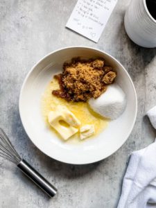 Begin by placing 4 tablespoons of butter into a microwave safe bowl and heat until the butter is very soft and partially melted. Add 1/4 cup of granulated sugar and 1/4 cup of brown sugar in with the butter and whisk until fully combined.