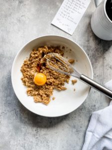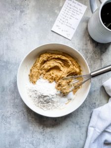 Add 3/4 cup of all purpose flour, 1/4 teaspoon of baking soda and 1/4 teaspoon of salt and mix until just combined. I usually do all of this mixing with a fork to avoid dirtying several utensils, but use what you have on hand.