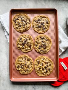 These cookies are the best. I love how thin and chewy they are. Don’t be shy about piling the chocolate into your cookie dough, because these are big cookies and they need plenty of chocolate in them.