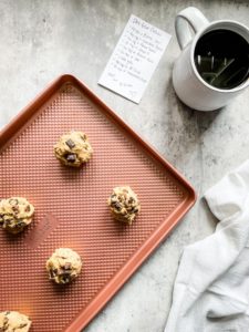 Divide the dough into 6 equal sized balls and place them onto a non-stick or parchment lined baking sheet leaving plenty of space between each portion. These cookies are big and they will spread out quite a bit during baking, so give them a little space.