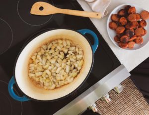 - Reduce the heat to medium and add 1 chopped yellow onion into the pot