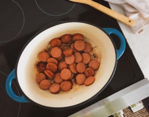 - Place the sliced smoked andouille sausage into a large pot or dutch oven and place over medium high heat
