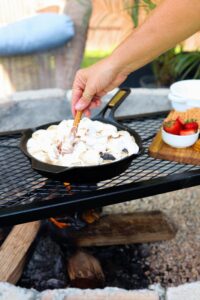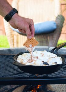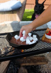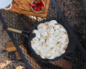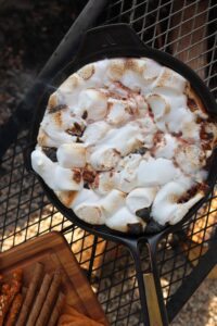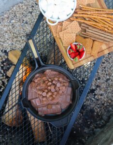 Once the chocolate is covered by marshmallows, don’t forget about the heat that it is over. You can’t really see the chocolate anymore, so it will be hard to tell if it begins to burn until it is scorched. If your fire begins to get rowdy, slide that skillet off to the side so the marshmallows can soften slowly.