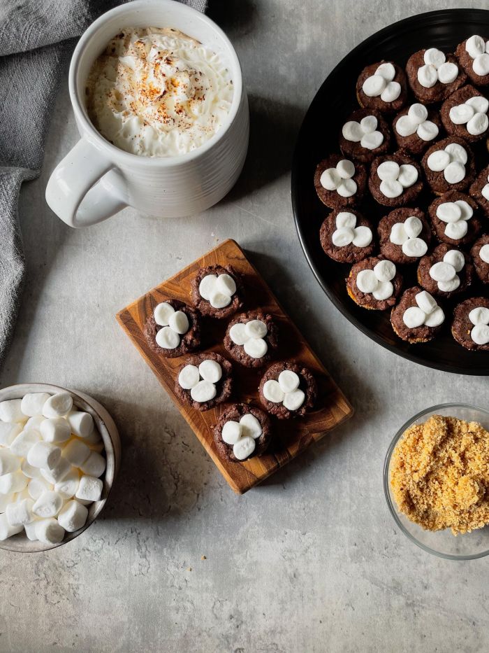 - As soon as you pull the cookies out of the oven, gently press mini marshmallows into the tops of each warm cookie