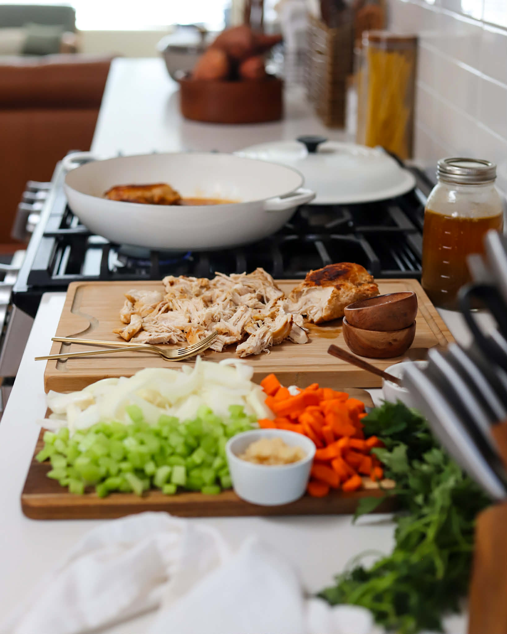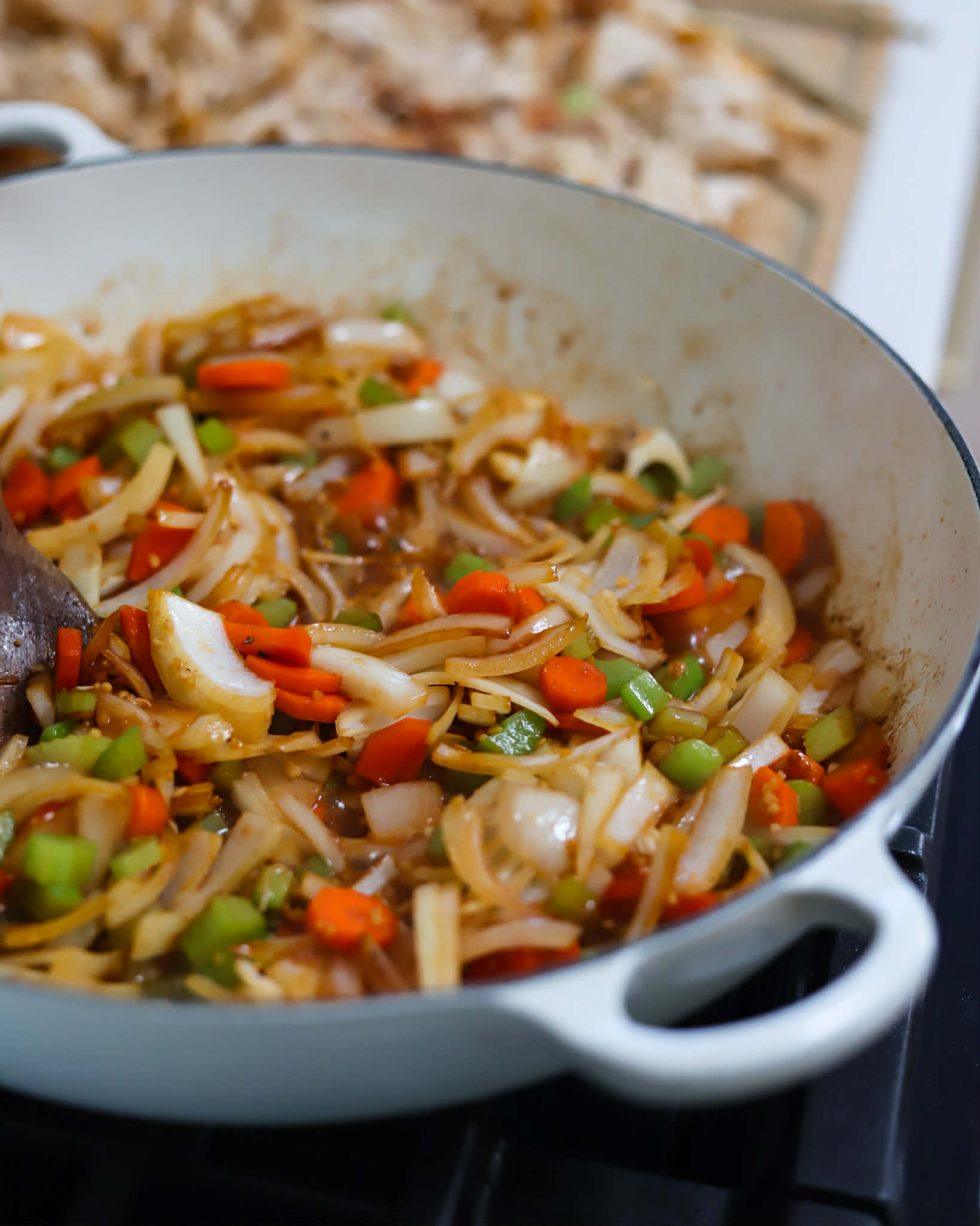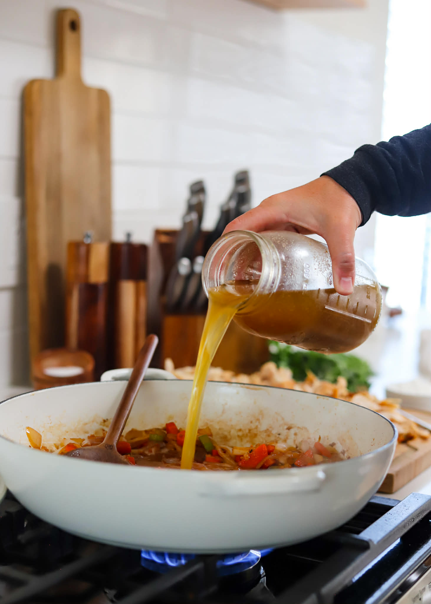Once the vegetables are tender, add 800ml of chicken stock and use a wooden spoon to work up all of those beautiful brown bits from the base of the skillet.