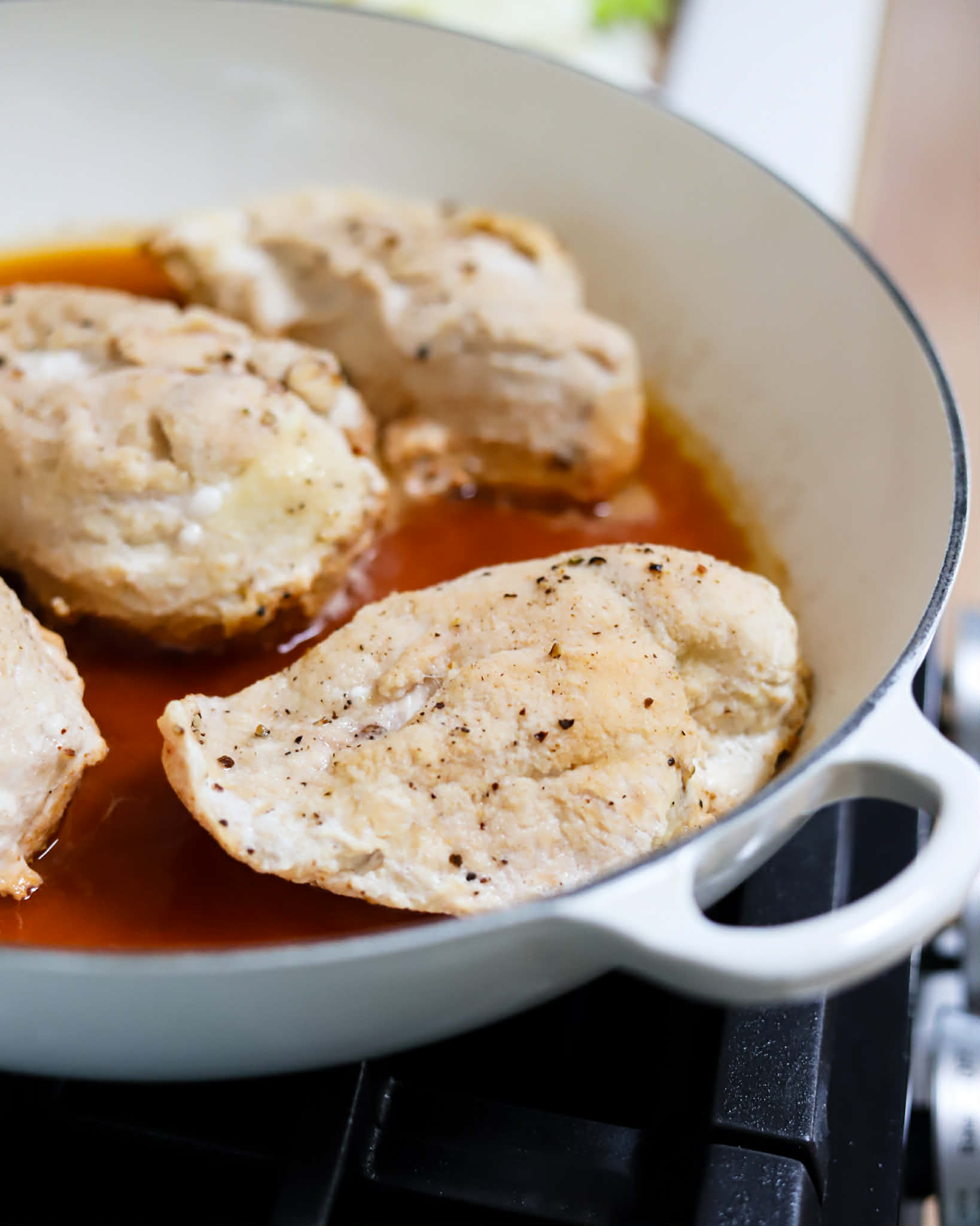 Cook the chicken until you no longer see pink inside and the internal temperature reaches 165 degrees and then transfer it out of the skillet and set it aside for now.