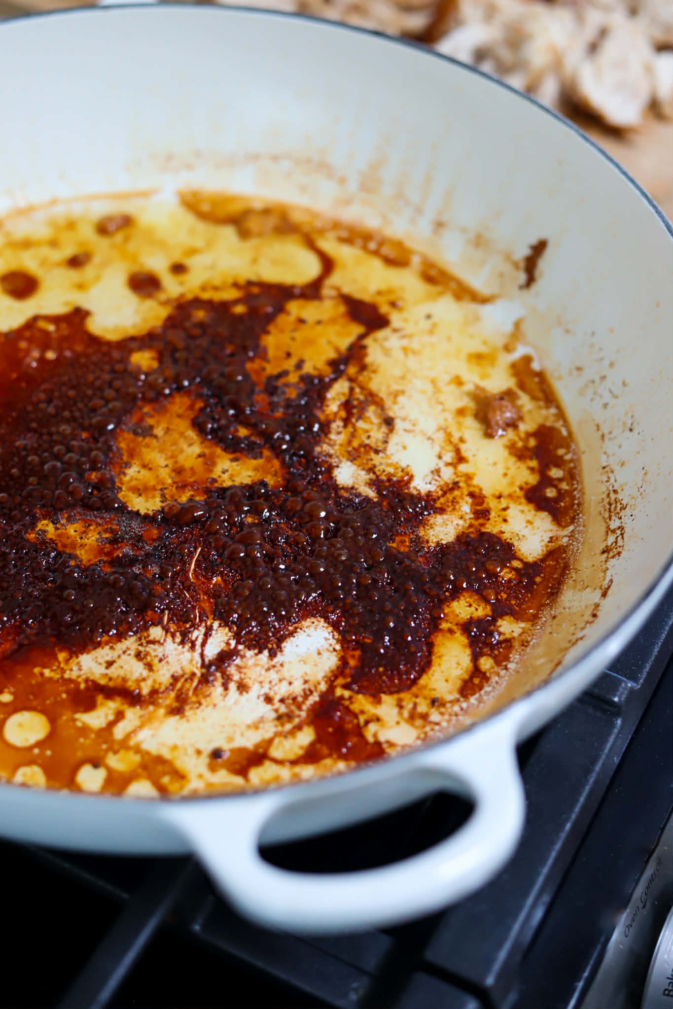 - Add 800ml of chicken stock and use a wooden spoon to work up any browned bits from the bottom of the skillet