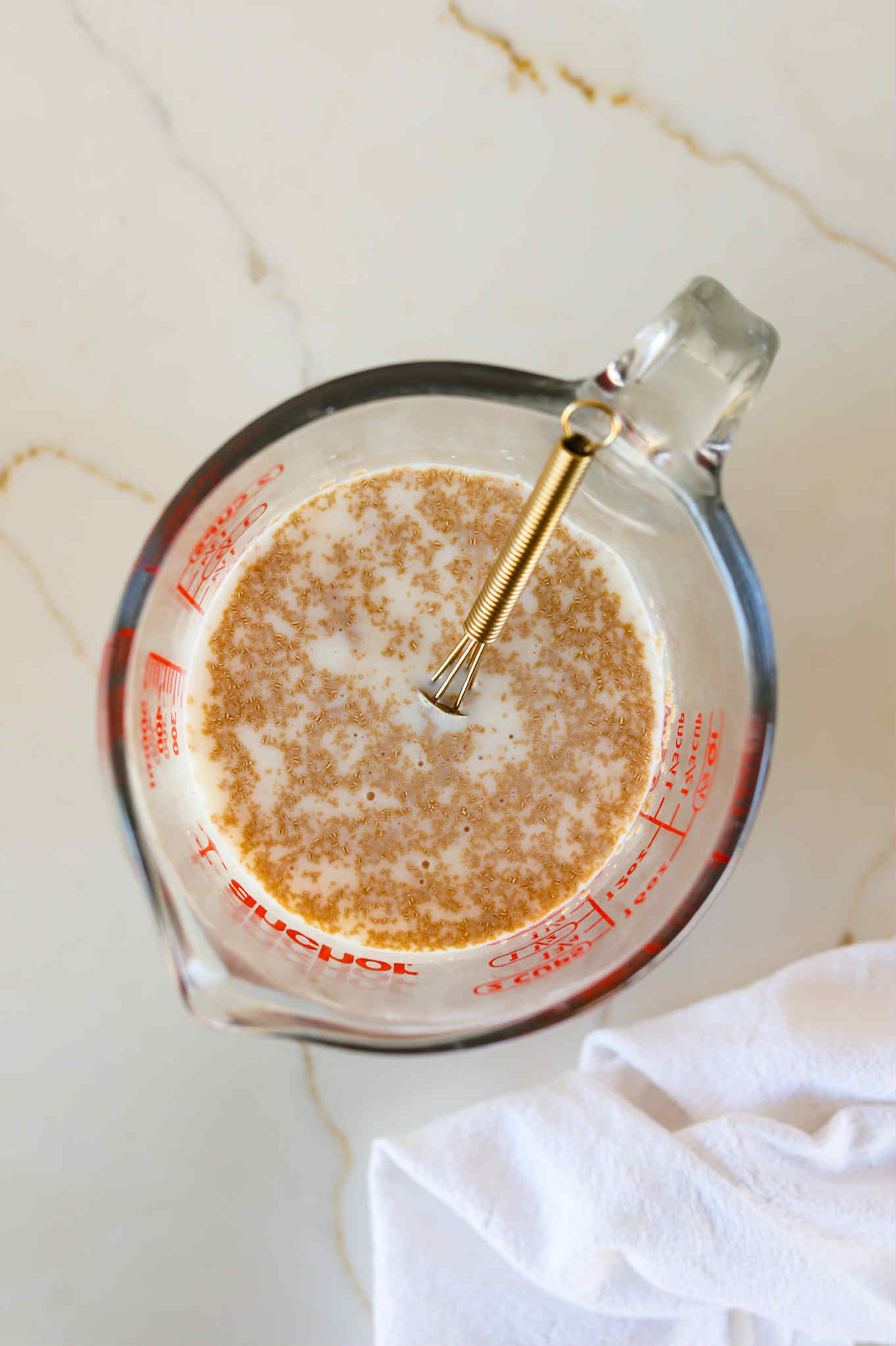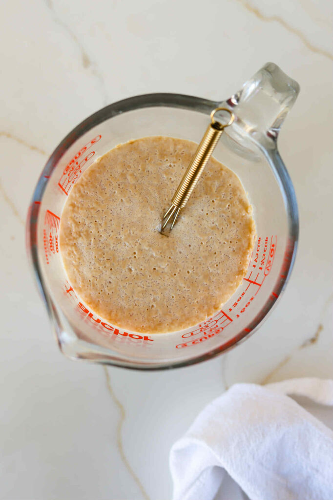 Start by waking up your yeast. Whisk 2 teaspoons of active dry yeast and a teaspoon of honey into 2/3 cup of warm whole milk and 1/2 cup of warm water. Set it aside for about 5 minutes or until the mixture gets foamy and smells like fresh bread.