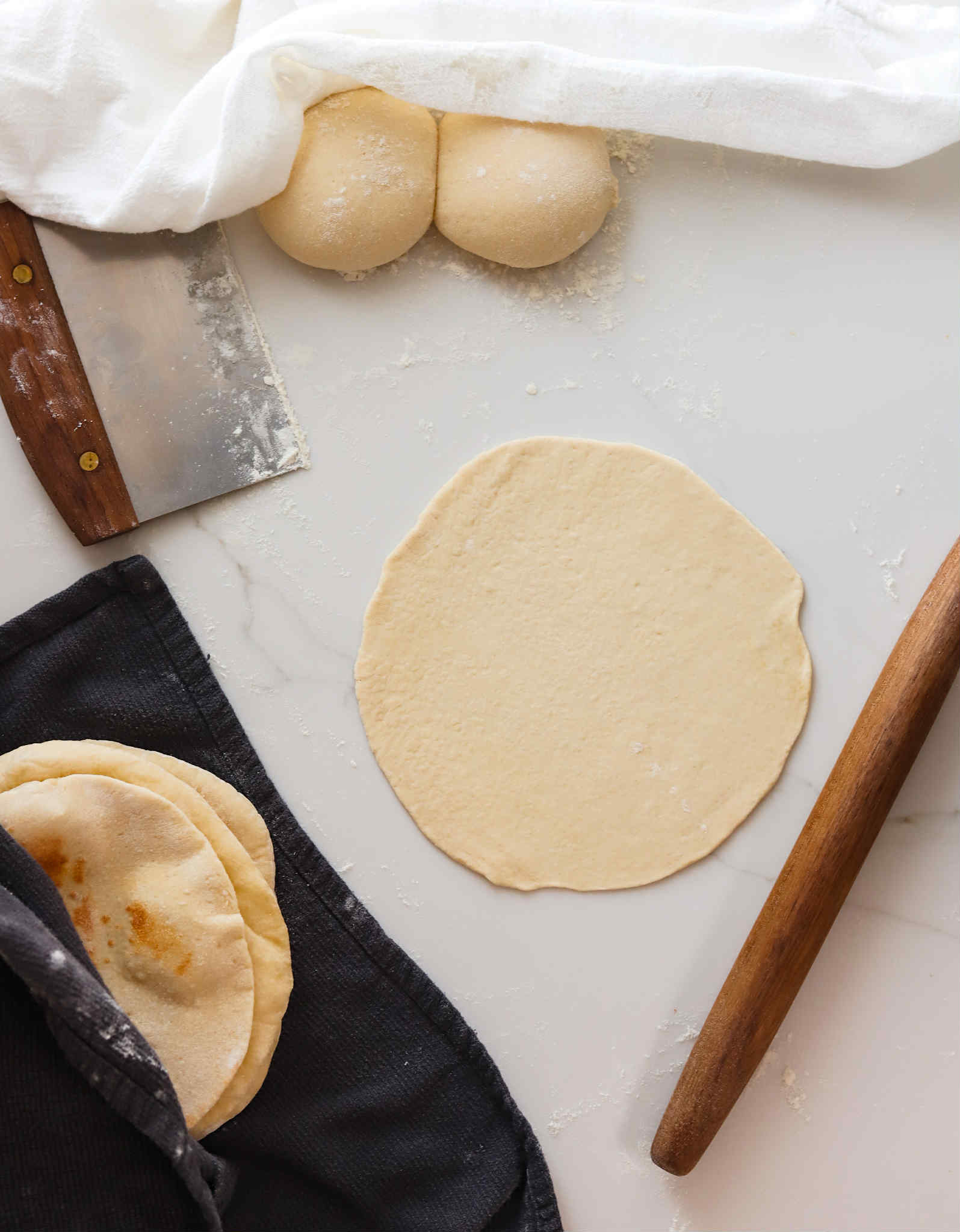 Repeat the process with each portion and continue to stack the cooked flatbreads on top of each other wrapped in the towel. The residual heat will keep them soft and flexible until you are ready to enjoy them.