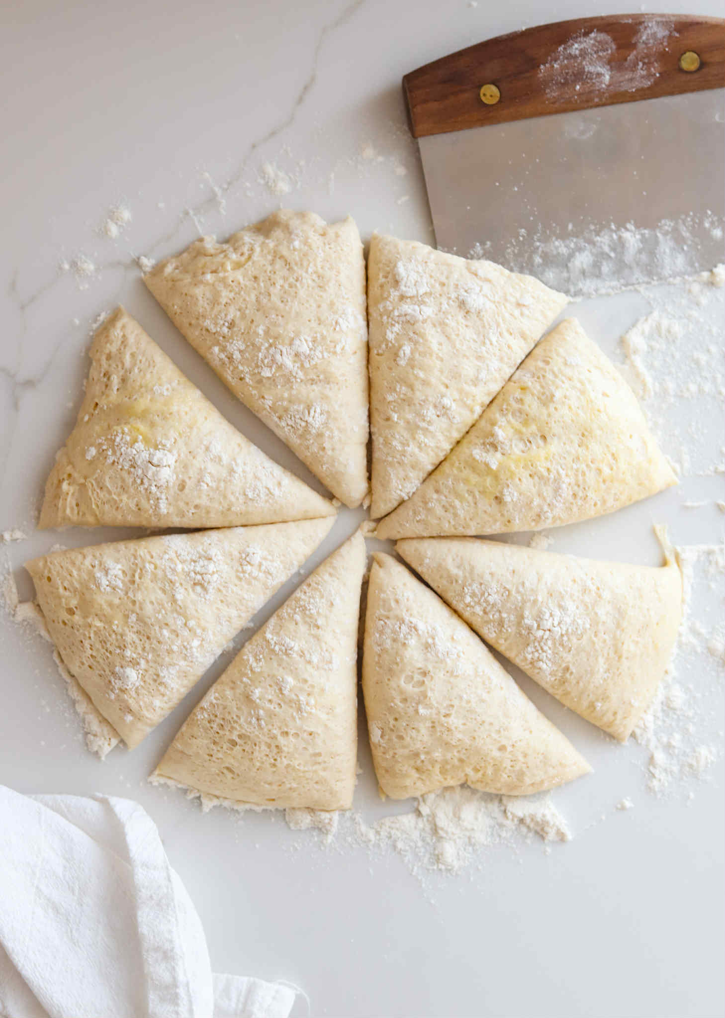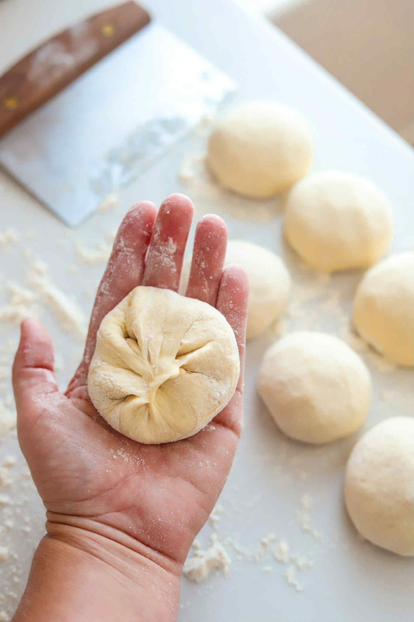 - Transfer the dough onto a lightly floured surface and divide into 8 equal portions