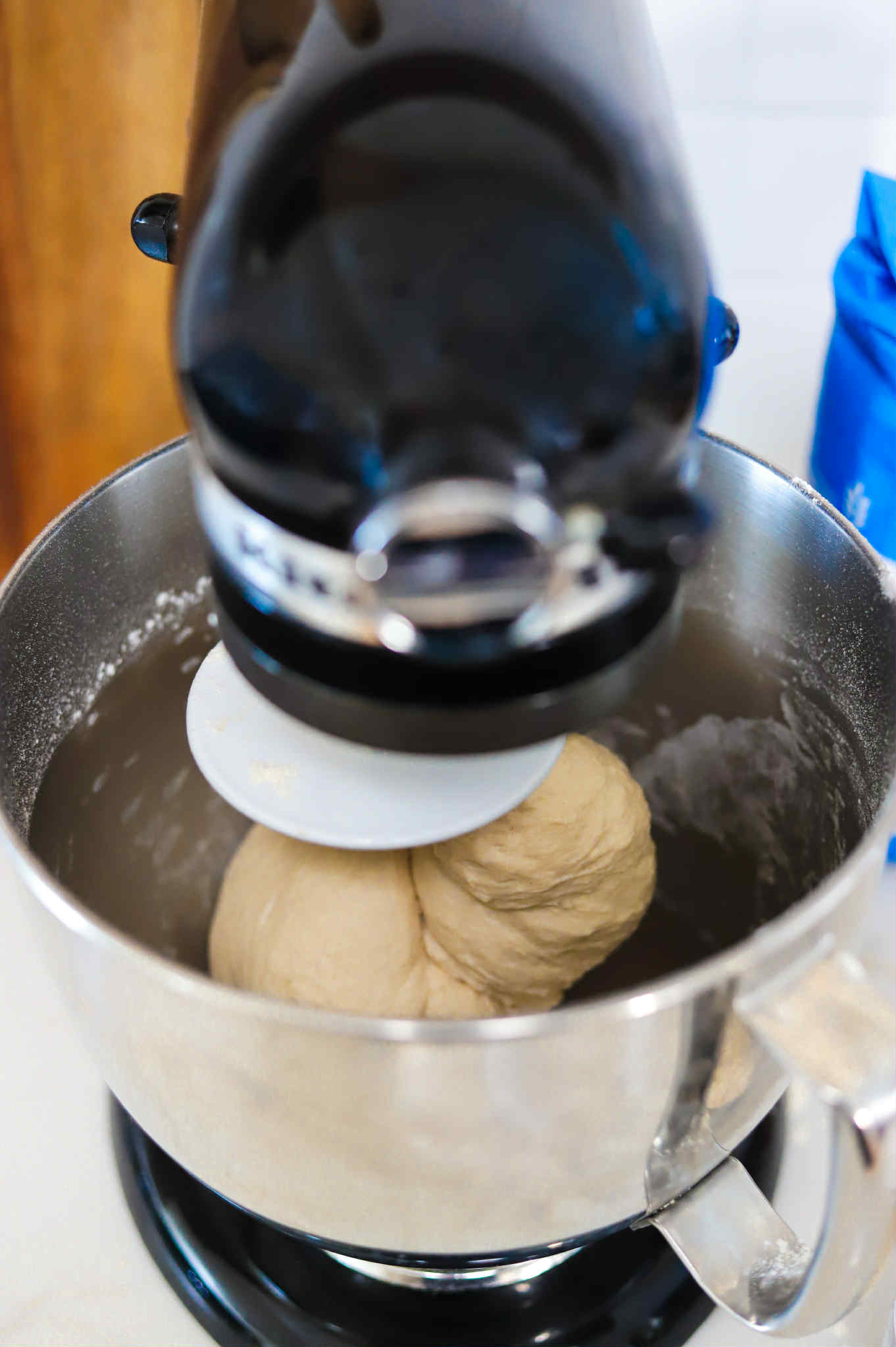 - Using the dough hook attachment or a dough whisk, slowly work the dough adding 2 additional cups of bread flour as you knead it into a dough