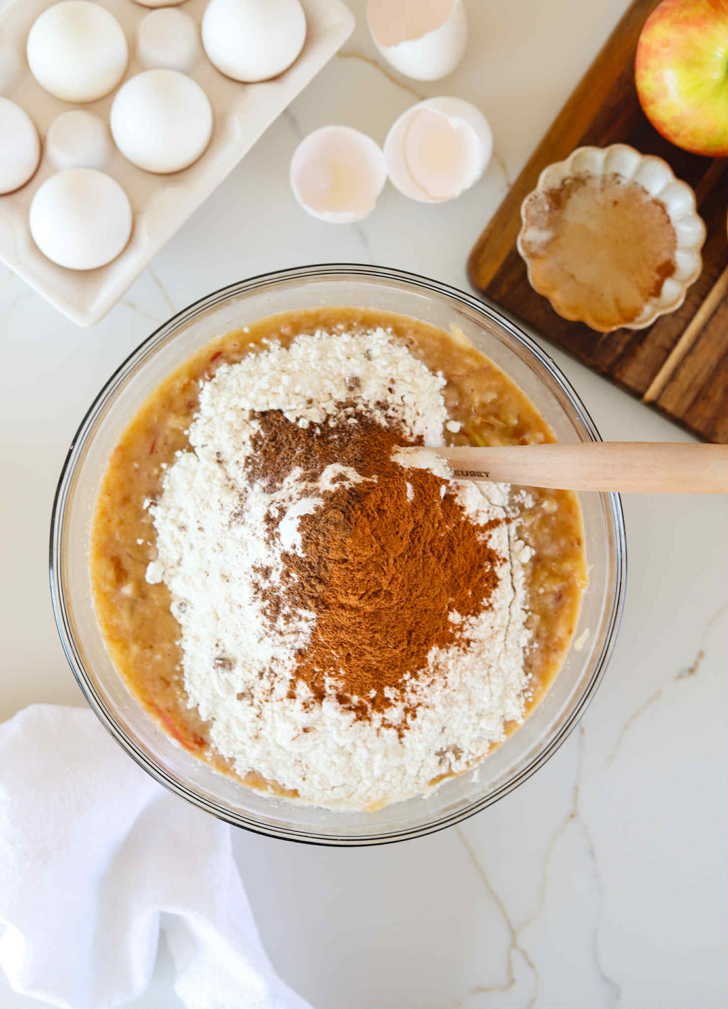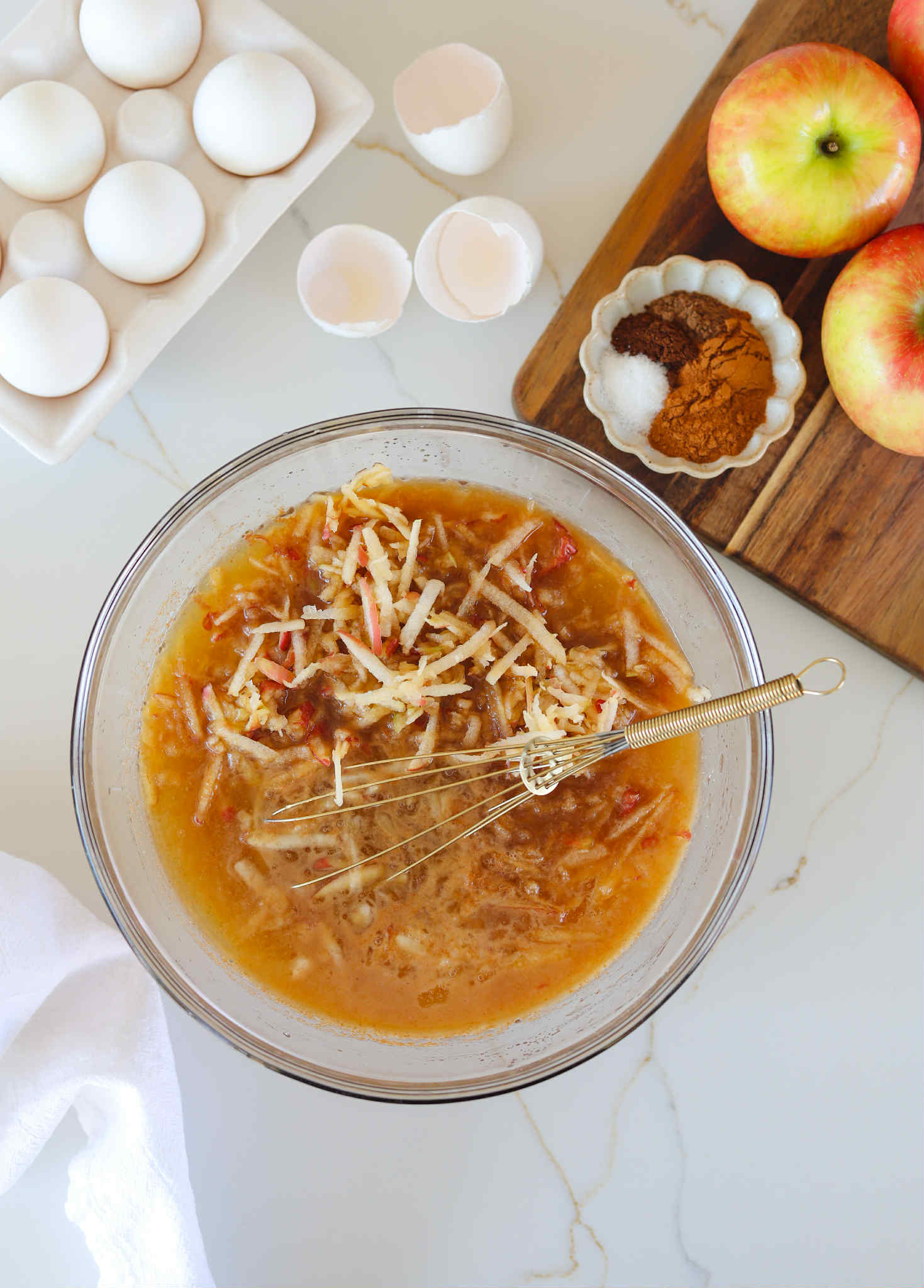 Grate 2 large apples over a clean kitchen towel (I always use honeycrisp apples for this batter, but feel free to use your favorite apples here) and squeeze most of the juices out before adding the apple into the batter.