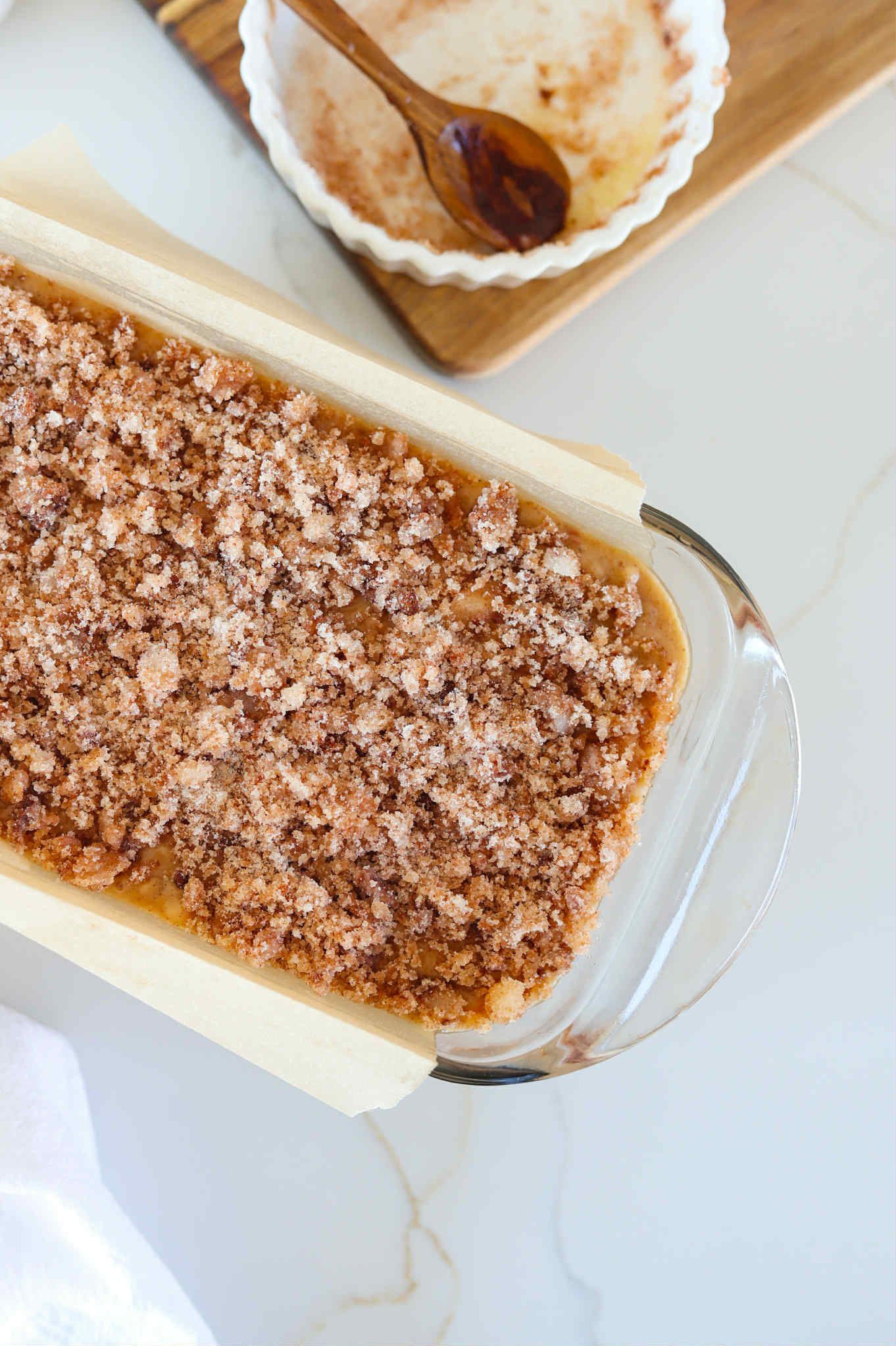 - Even sprinkle the cinnamon crunch topping over the batter