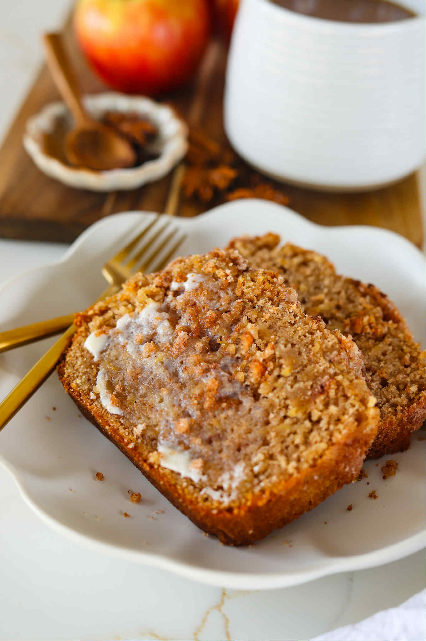 The reduced cider and grated apples impart so much flavor into this loaf and it also gives it a wonderfully moist and tender texture. If you are looking for a simple and cozy apple cider loaf then I would love for you to give this one a try!