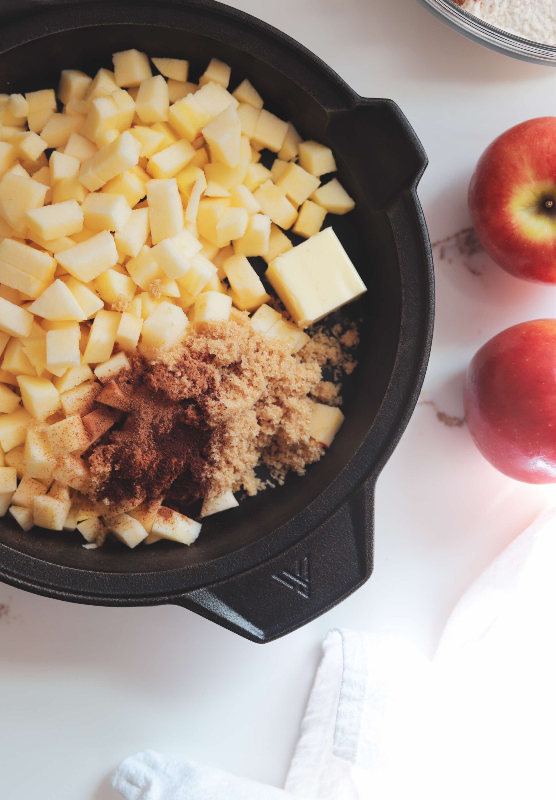 Begin by combining 3 peeled and diced apples with 2 tablespoons of butter, 1/4 cup of brown sugar, 1/2 teaspoon of ground cinnamon, 1/2 teaspoon of nutmeg, 1/4 teaspoon of cloves and a pinch of salt in a large skillet.