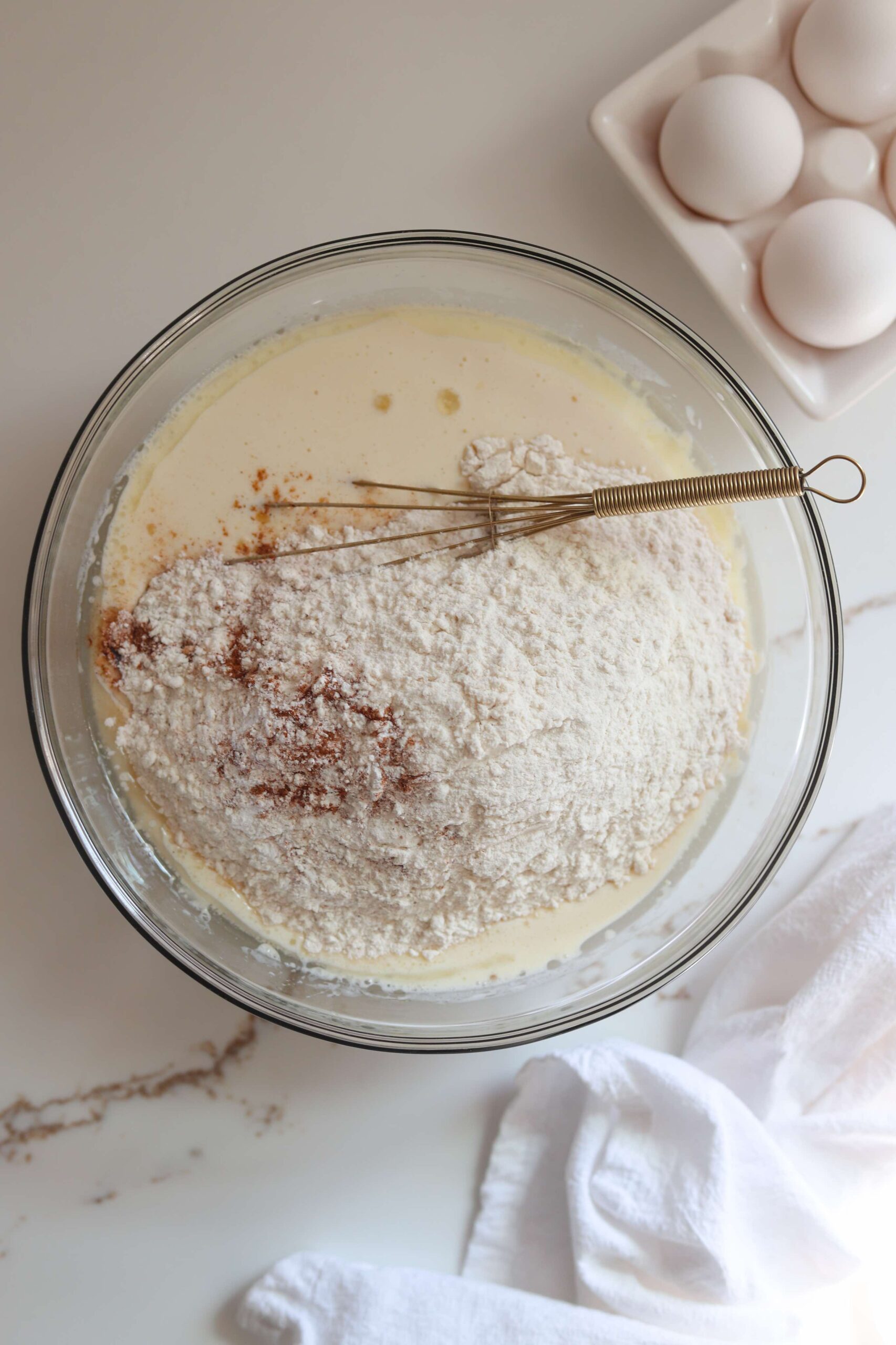 - In a separate bowl or mesh sifter, combine 2 cups of all-purpose flour, 1/4 cup of brown sugar, 2 teaspoons of baking powder, 1/2 teaspoon of baking soda, 1/4 teaspoon of salt, 1 teaspoon of ground cinnamon and 1/2 teaspoon of ground nutmeg and add to the buttermilk mixture