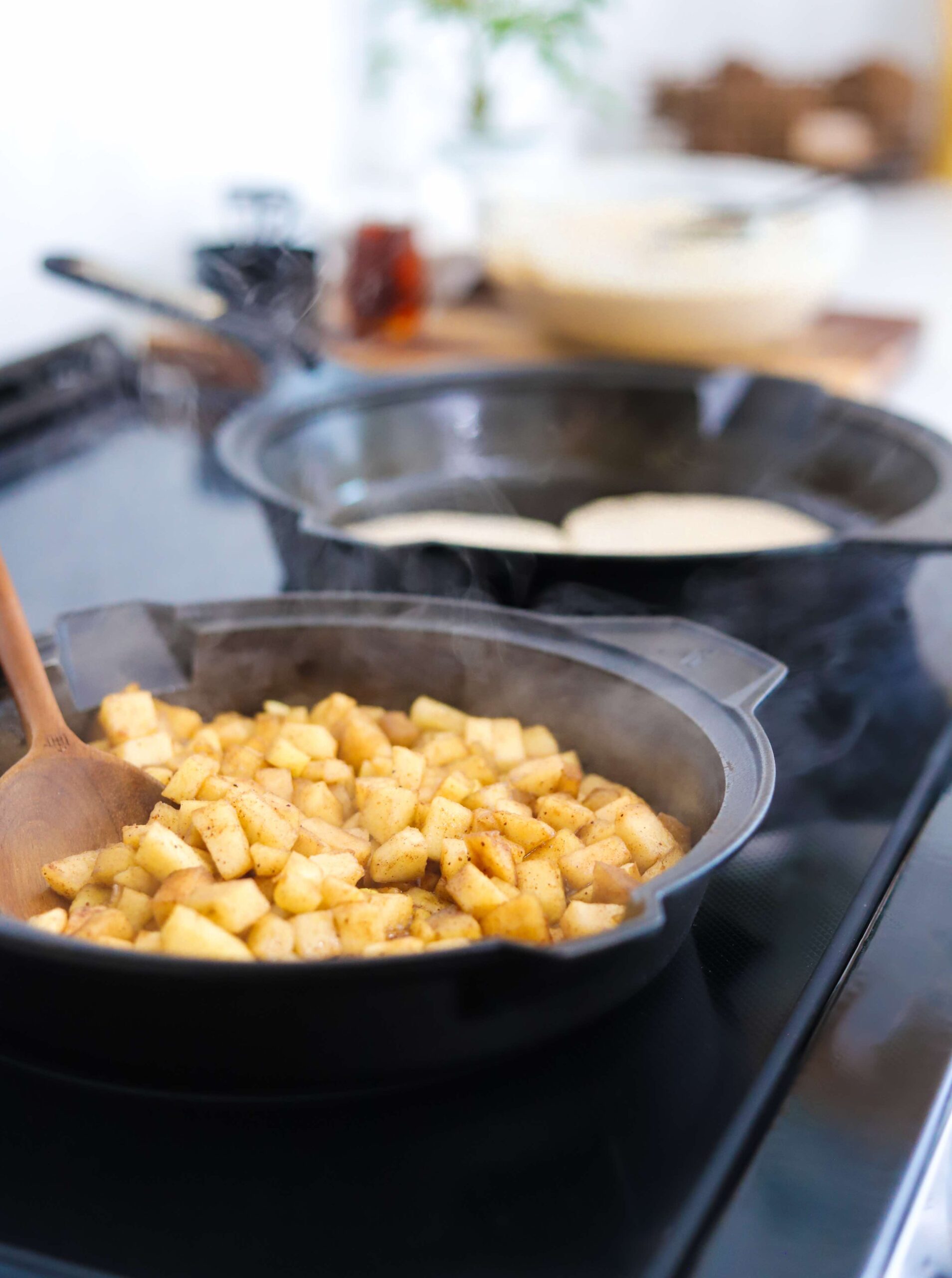Place the skillet over medium heat and bring the apples to a simmer while you make the pancake batter.