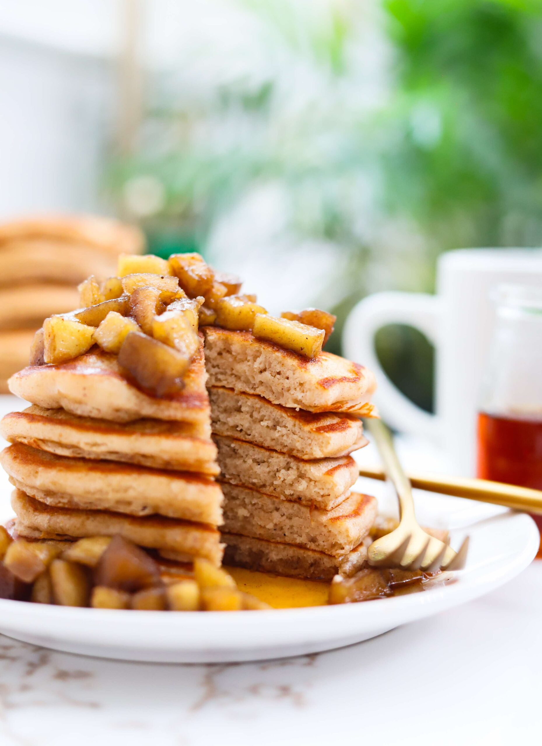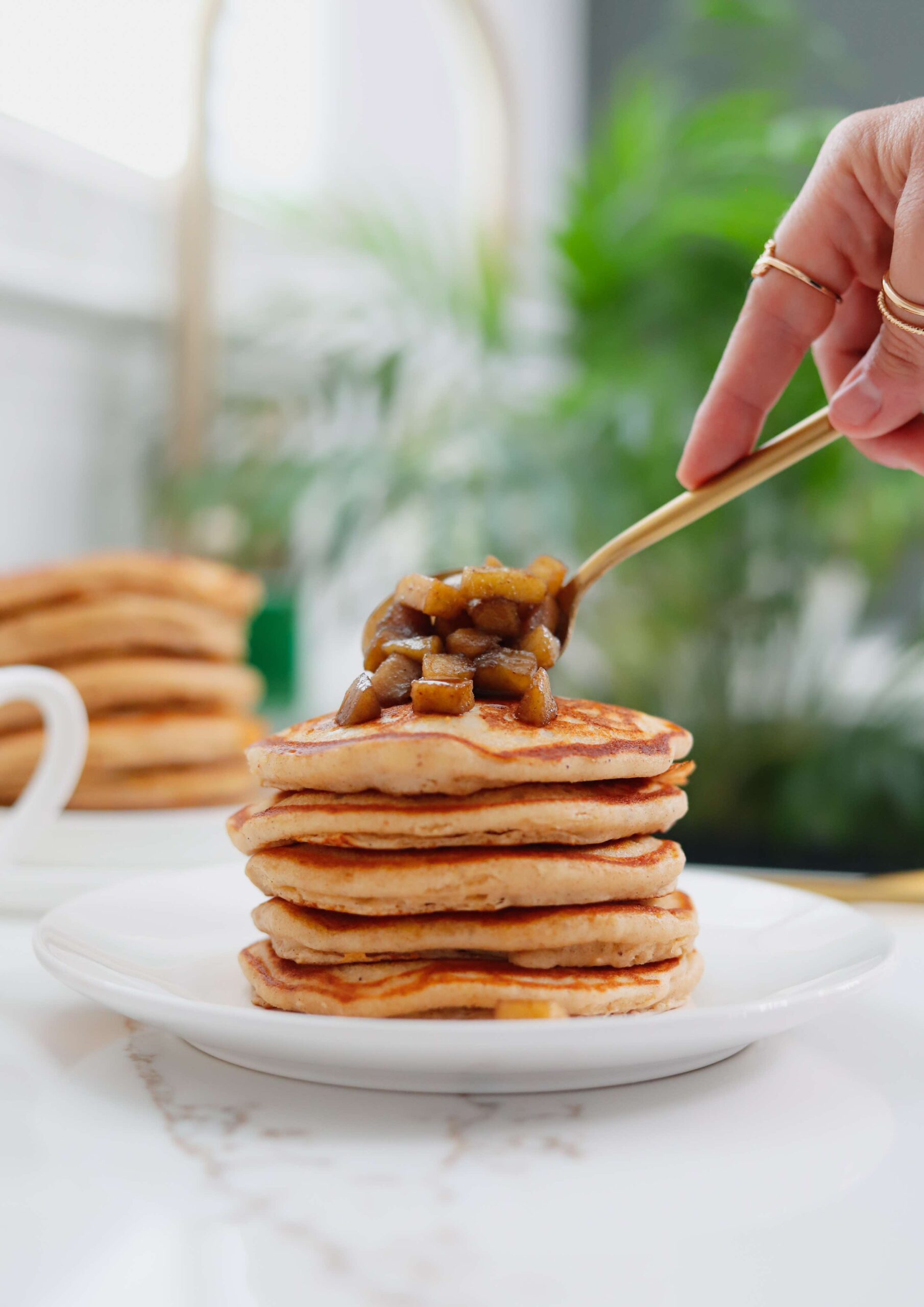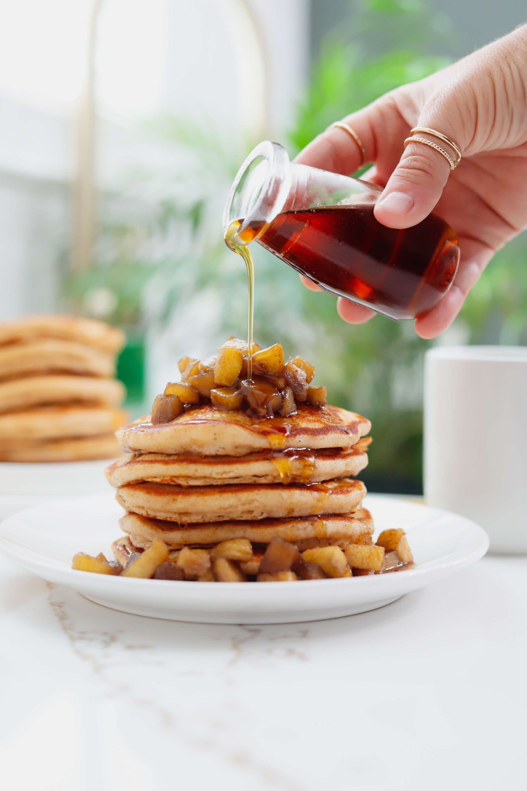 Today, we are making a batch of fluffy spiced buttermilk pancakes and topping them with caramelized apples. These flapjacks are sheer perfection and with fall right around the corner, they will be making a regular appearance on our weekend breakfast plans.