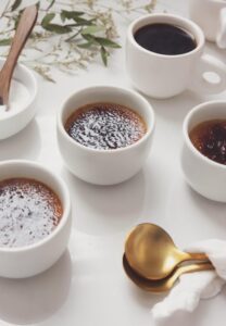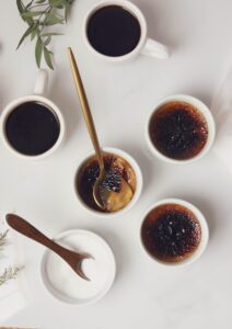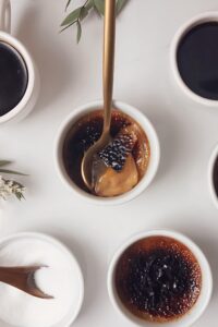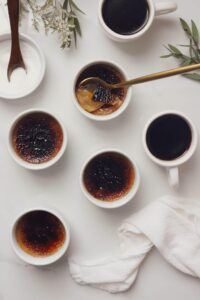 - When ready to serve, sprinkle about a tablespoon of granulated sugar over the surface of each ramekin and use a brûlée torch to brûlée the sugar until deeply caramelized