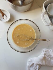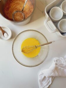 Whisk 3 egg yolks in a large bowl until they are fully combined and pale yellow in color. The lightening of the color lets you know that some air has been incorporated into the yolks and this is an important part in developing a great texture in your custard.