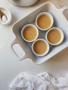 Divide the mixture between four 4 ounce ramekins. If you don’t have ramekins, crème brûlée can be baked in any small oven safe baking dish that holds about 1/2 cup of liquid.
