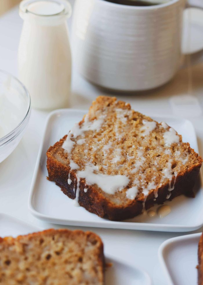 Now to me, this spiced pear quick bread is pretty perfect as is, but if you want to add a little glaze then whisk 1-2 teaspoons of milk into a cup of sifted confectioners sugar and maybe add a pinch of cinnamon in there too.