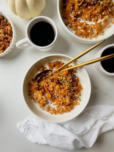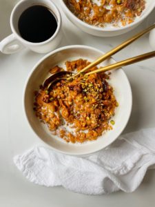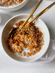 Today, I am adding a big pinch of vanilla granola and some pistachios, but any nuts, seeds or dried fruit you may have in your pantry will work great. If you don’t like heavy cream, you can add a splash of almond milk or even some greek yogurt to your oatmeal to both cool things off and add a layer of silkiness to the overall experience.