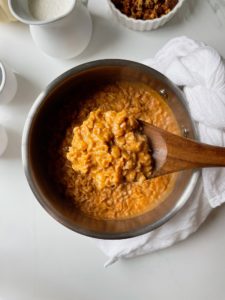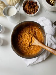 Once the mixture begins to thicken and the oats are tender, turn the heat off and let the oatmeal sit for 2-3 minutes. This will allow the oats to absorb a little bit more of the spiced pumpkin almond milk and set up a bit more.