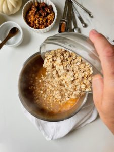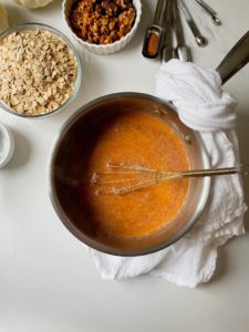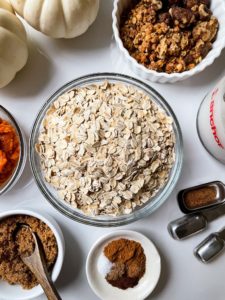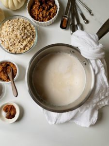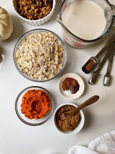 For two servings, you will need 1 – 1 1/4 cups of old fashioned oats (depending on how thick you like your oatmeal), 2 cups of unsweetened vanilla almond milk, 1/2 cup of pure pumpkin puree, 1/2 teaspoon of ground cinnamon, 1/8 teaspoon of ground cloves, 1/8 teaspoon of all spice, 1/8 teaspoon of nutmeg, 1/8 teaspoon of salt and 2 tablespoons of brown sugar.