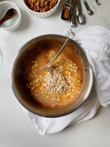 Once this mixture begins to simmer, stir in your oats. If you like your oatmeal on the thicker side, I would add 1 and 1/4 cups of old fashion oats, but if you prefer your oatmeal a bit looser, only add 1 cup of oats.