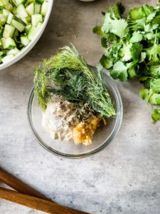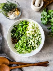 This salad is really easy to bring together. Start by finely chopping 1 cup of cabbage, 1 cup of leafy green lettuce, 1/2 of a small English cucumber, 1/2 green bell pepper, 3 spring onions, 1/3 cup of your favorite fresh herbs and 1 tablespoon of pickled jalapeños.
