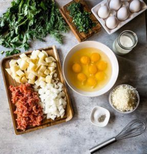 Begin by gathering 8 eggs, 8 ounces of italian sausage, 1 large russet potato that has been peeled and cut into bite sized pieces, 1 small diced yellow onion, 4 ounces of shredded mozzarella, 1/4 cup of heavy cream, 1/3 cup of fresh herbs and salt and black pepper.