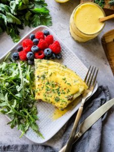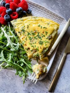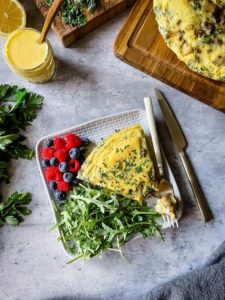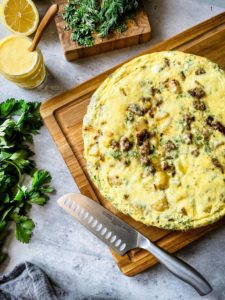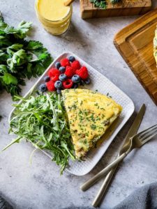 This frittata can be garnished with a dollop of sour cream, plain greek yogurt or a drizzle of hollandaise sauce. Sprinkle with a little extra fresh herbs and breakfast is served!